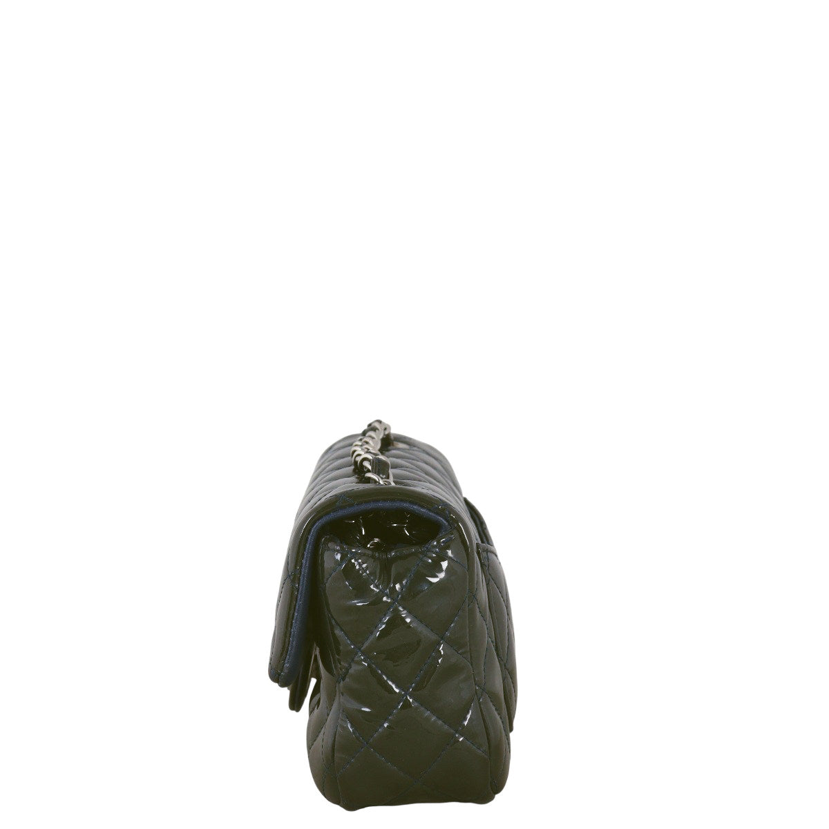 Features: Olive green quilted patent leather exterior; navy blue stitching; silver tone hardware; chain and leather entwined shoulder strap; flap with CC turn-lock closure to main compartment; navy leather lined interior with 1 x zip pocket and 1 x slip pocket.
