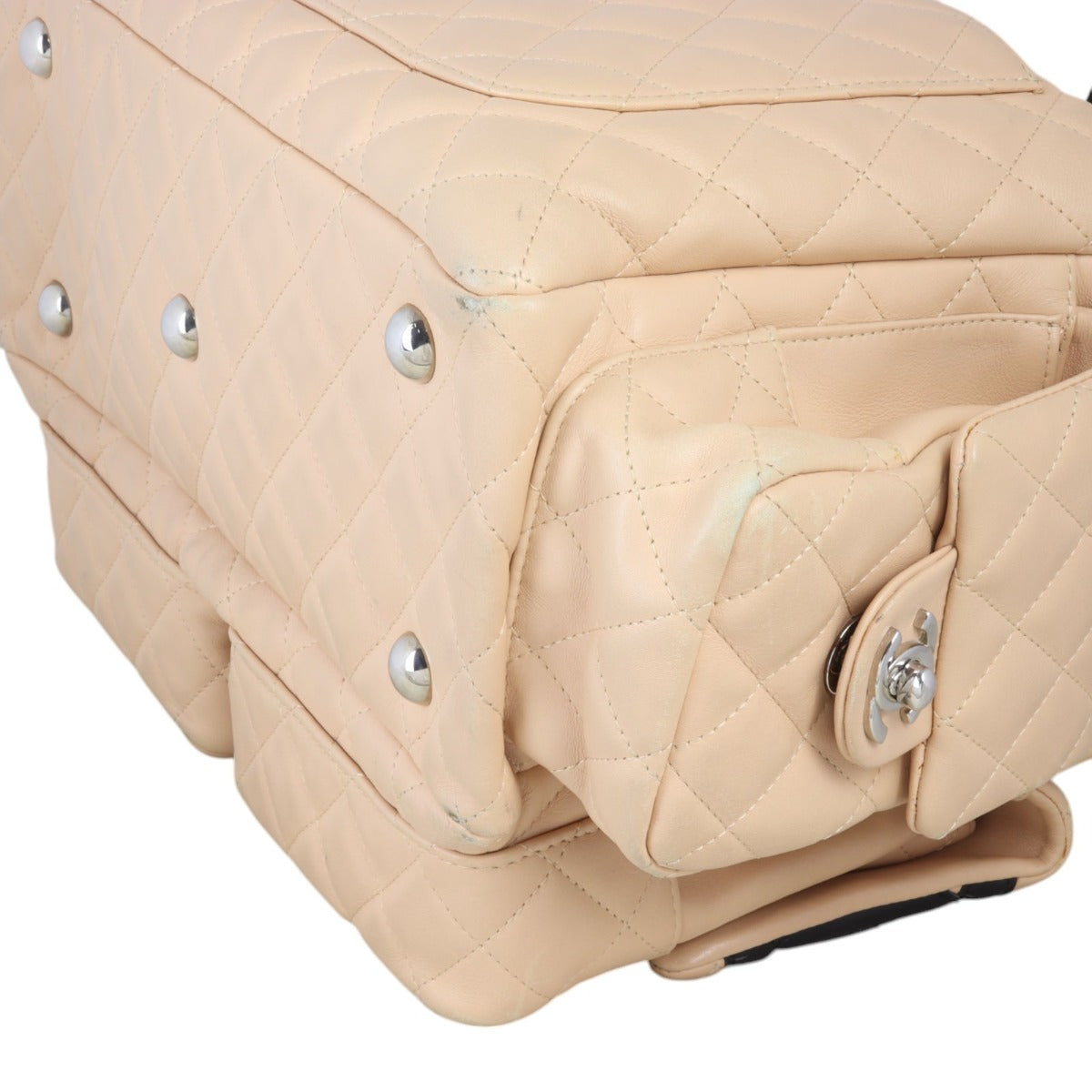 Features: Beige quilted lambskin exterior with black leather 'CC'; black double rolled leather handle with knot detail; silver tone hardware; 4 x exterior flap compartments with CC turn locks; 1 x exterior slip pocket; top zip closure to main compartment; black jacquard lining; 1 x zipped pocket; 2 x slip pockets.