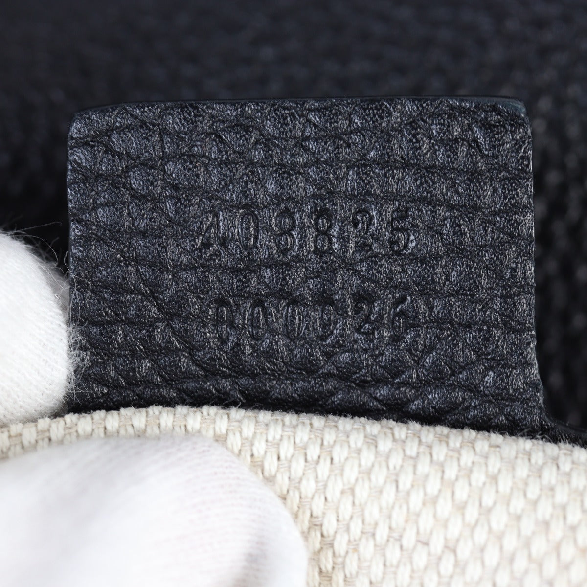 Features: Black pebbled calfskin leather exterior; double G logo stitched on front; pale gold tone hardware; leather tassel on zip pull; single flat leather handle; detachable and adjustable leather shoulder strap; top zip closure to main compartment; beige canvas lined interior including 1 x zip pocket and 2 x slip pockets.