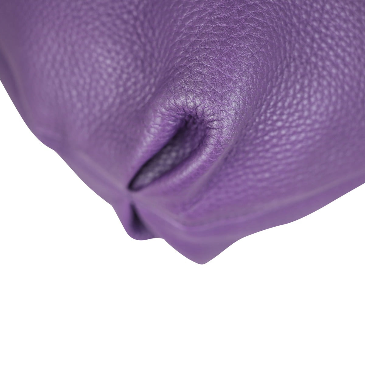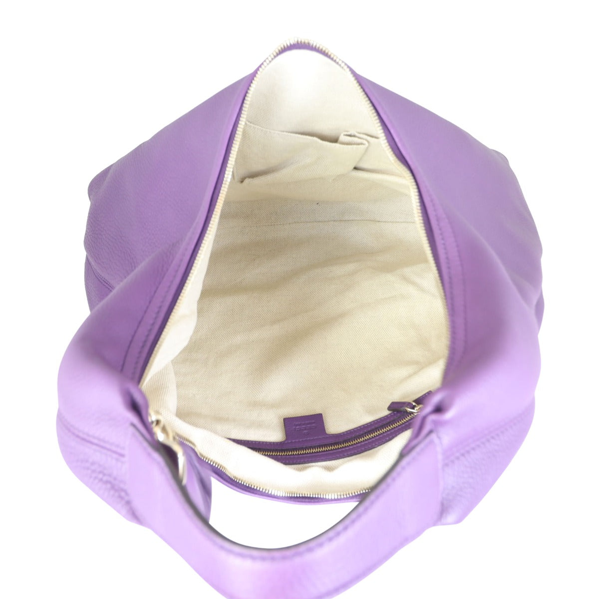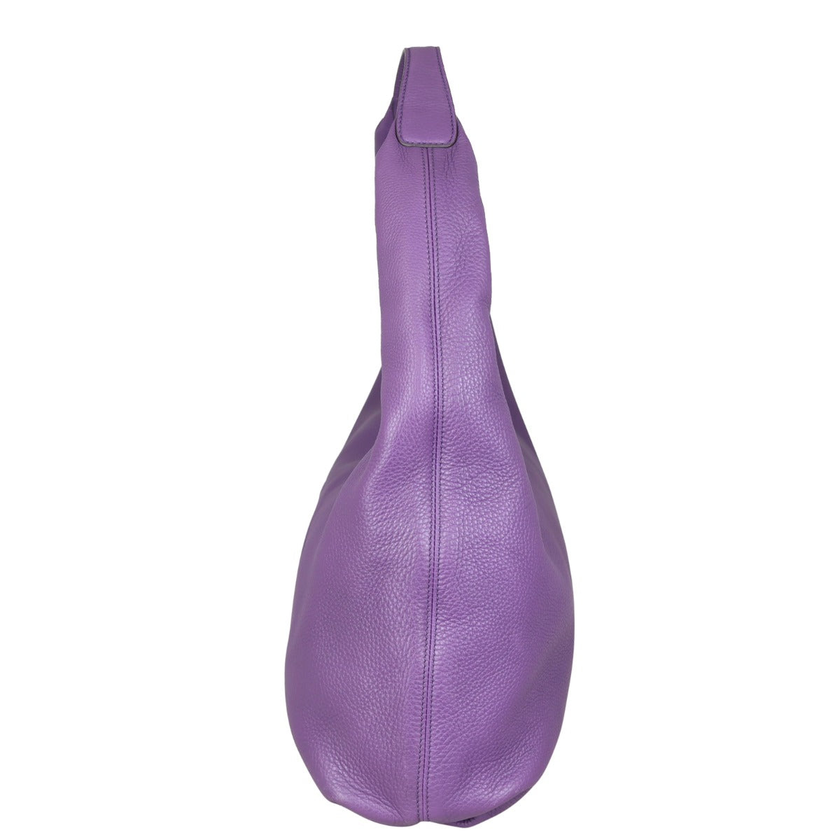Features: Royal purple pebbled calfskin leather exterior; double G logo stitched on front; pale gold tone hardware; leather tassel on zip pull; single flat leather shoulder strap; top zip closure to main compartment; tonal textile lined interior including 1 x zip pocket and 2 x slip pockets.