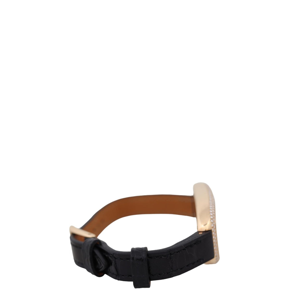 Materials: 18k rose gold case set with 150 round brilliant diamonds (0.66 ct); black crocodile leather strap with tan leather lining.